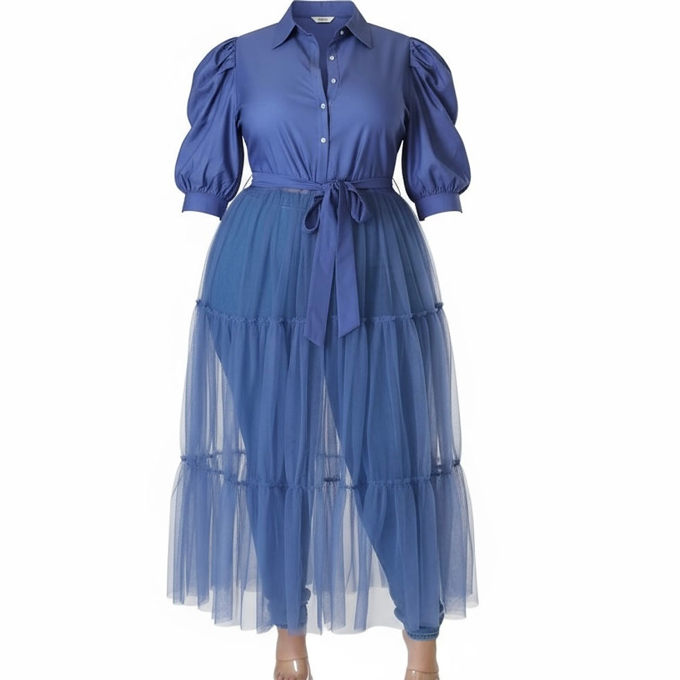 Conjunto de blusa azul con mangas abullonadas y pantalón con sobrecapa de tul
